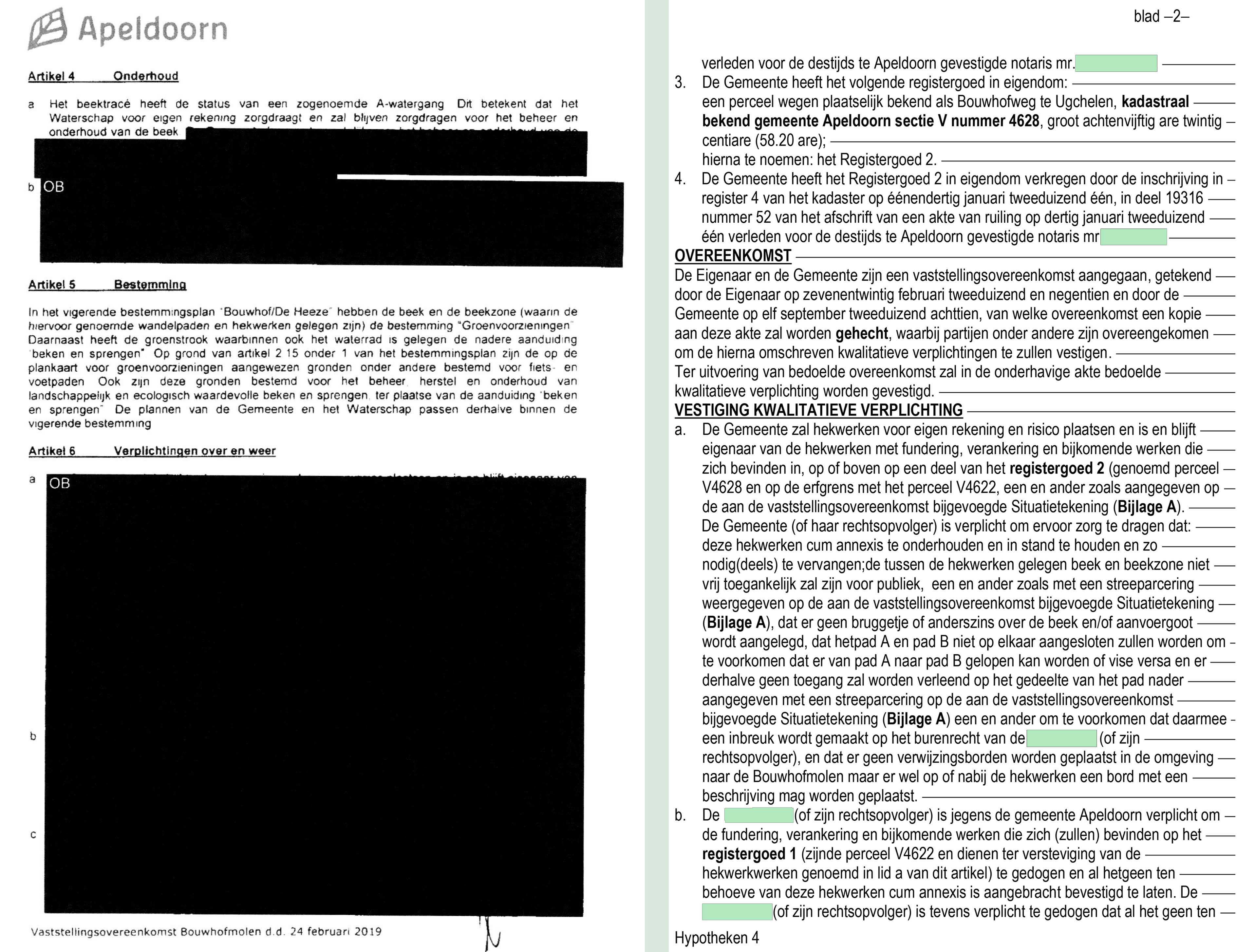 Gemeente belooft wel onderzoeken, maar blijft daarna stil Dossier Bouwhofmolen in de doofpot? Het dossier Bouwhofmolen dreigt opnieuw in de doofpot terecht te komen. Na de publicaties op deze website werd (opnieuw) een onderzoek gestart door gebiedsmanager Alan Wemmenhove. De raadsleden Stefanie Hilferink (VVD) en Antoon Huigens (BVNL) meldden “het ziet er naar uit dat er fouten zijn gemaakt” en “het ligt juridisch erg moeilijk” maar verder kwamen ze niet. Ondanks een “Ik kom erop terug” bleef iedereen doodstil. De afdeling voorlichting van de gemeente beantwoordt elke vraag met “we gaan ermee aan de slag”, daar blijft het bij. Gepubliceerd: 20 December 2022 Het verhaal van het gemeentelijk monument De Bouwhofmolen begint rond de eeuwwisseling. In 1998 besluit de gemeente in overleg met projectontwikkelaar Van Berlo dat de oude wasserij wordt gerestaureerd. Ook spant de gemeente zich in om een waterrad aan het pand te bevestigen. In 2001 wordt de gemeente de eigenaar van de grond en de beek. Dan kan begonnen worden met de reconstructie van het waterrad, de wateraanvoergoot en het wandelpad. Hiervoor lijkt ruim vijftig duizend euro subsidie te zijn uitgegeven maar uit stukken blijkt niet waaraan dat geld is besteed. Vrijwilligers besteedden veel tijd aan het onderhoud. In 2013 is nog eens veel vrije tijd geïnvesteerd en zijn opnieuw enkele duizenden euro’s subsidie van gemeente en dorpsraad uitgegeven aan herstelwerkzaamheden. Plotseling een hek In 2019 verschijnt plots een hekwerk en wordt het wandelpad afgesloten. Hoe dat kon gebeuren blijft een raadsel. Een handhavingsverzoek van de stichting Vrienden van de Hamermolen verdween in een la. In maart 2020 komt het voltallige college voor een werkbezoek naar Ugchelen. Voordat het busje met de collegeleden en buurtmanager Harriët Althof zich op de afgesproken plaats bij Albert Heijn meldt, maakt het eerst een stop aan de Bouwhofweg en bezoekt het gezelschap ter plaatse het afgesloten pad en inmiddels teloorgegane waterrad. Later heeft toenmalig wijkwethouder Jeroen Joon, onder andere door bestuursleden van de Stichting Vrienden van de Hamermolen, ter plaatse de situatie bekeken en hij beloofde een onderzoek. Al die onderzoeken leidden tot niets. Het heeft er alle schijn van dat dat ook de bedoeling is. Zwartgelakte A4-tjes. Op 11 september 2018 heeft een gemeenteambtenaar de overeenkomst met de bewoner van de het pand getekend. We mogen niet weten wat is afgesproken met betrekking tot het wandelpad rond het gemeentelijke monument. De gemeente levert aanvankelijk na een WOB-verzoek nauwelijks informatie. De betrokken ambtenaar is inmiddels weg en dat lijkt een vrijbrief te zijn om te verklaren dat er ook niet meer informatie is. Na een bezwaar tegen dat besluit worden nog enkele besluiten openbaar gemaakt. Het zijn hoofdzakelijk zwartgelakte A4-tjes. Lees verder onder de afbeelding. De leden van het college weten en wisten, ook tijdens het werkbezoek aan Ugchelen in maart 2020, precies wat is afgesproken. Op 8 april 2019 besloot datzelfde college dat de gesloten overeenkomst moet worden omgezet in een notariële akte. Die akte (een zogenaamde “vestiging kwalitatieve verplichting”) is op 16 mei 2019 door een Apeldoornse notaris opgesteld en op dezelfde dag om 12:25 uur ingeschreven in het openbare register van het Kadaster. Afspraken toch openbaar Wat de gemeente niet openbaar wil maken, staat grotendeels beschreven in die akte. Zo blijkt dat de afspraken niet alleen gelden voor de gemeente en de huidige bewoner, maar ook voor eventuele rechtsopvolgers. Dus als de gemeente het wandelpad of de huidige eigenaar zijn woning verkoopt, dan zijn de nieuwe eigenaren volgens deze akte ook gehouden aan deze afspraken. Verder blijkt dat het afsluiten van het openbare wandelpad met een hek niet het enige is dat de partijen overeenkwamen. Ook mag de gemeente aan de Bouwhofweg geen verwijzingsborden plaatsen naar het gemeentelijke monument de Bouwhofmolen. Inbreuk burenrecht De gemeente Apeldoorn (of haar rechtsopvolger) is verplicht ervoor te zorgen dat de hekwerken met alles wat erbij hoort, te onderhouden, in stand te houden en zo nodig (deels) te vervangen. De tussen de hekwerken gelegen beek en beekzone mogen niet vrij toegankelijk zijn voor publiek. Ook mag geen bruggetje of anderszins over de beek en/of aanvoergoot wordt aangelegd om te voorkomen dat rondgelopen kan worden. Daarmee wordt volgens de akte voorkomen dat een inbreuk wordt gemaakt op het burenrecht van de heer bewoner (of zijn rechtsopvolger). “Deze overeenkomst houdt geen stand’ Het is maar de vraag of hetgeen in de overeenkomst en de volgende notariële akte wel standhoudt. Juristen die wij hebben geraadpleegd, betwijfelen of een beroep kan worden gedaan op dit in het Burgerlijk Wetboek genoemde burenrecht. Het pad was immers (ook op het moment van aankoop van de woning door de huidige eigenaar) al een openbare weg en rechten die voor het vestigen van de kwalitatieve verplichting bestonden, blijven volgens artikel 6.252 na vestiging van deze kwalitatieve verplichtingen ook geldig. In een eerdere publicatie .is al uitgelegd dat het afsluiten van een openbare weg de bevoegdheid is van de gemeenteraad. Zorgplicht Een andere vraag is of de notaris deze akte wel had mogen opstellen? Is het niet zijn zorgplicht om na te gaan of het wandelpad met deze akte wel rechtsgeldig afgesloten mocht worden? Op die vragen geeft de betrokken notaris geen antwoord. Zijn ambtsgeheim verbiedt hem om met derden over deze akte te spreken. Professor mr. W.G. Huijgen, emeritus hoogleraar Notarieel recht, wil wel antwoord geven op die vraag. Zonder de details te kennen acht hij het aannemelijk dat de notaris is afgegaan op de informatie die hij van overheidswege is heeft gekregen. De heer Huijgen stelt klip en klaar: “Een notaris mag ervan uitgaan dat een overheid bekend is met de regels.” Doofpot Sinds de vorige publicaties op deze website is gebiedsmanager Alan Wemmenhove op zo
